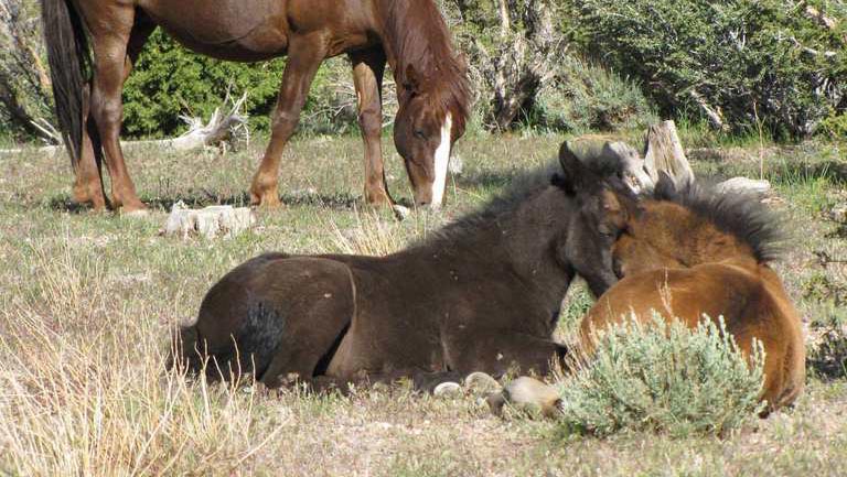 In hot treeless range, a pair of mares may stand head to head over a sleeping foal to give it shade. This increases the social bonds between band members and is a wonderful scene to photograph.